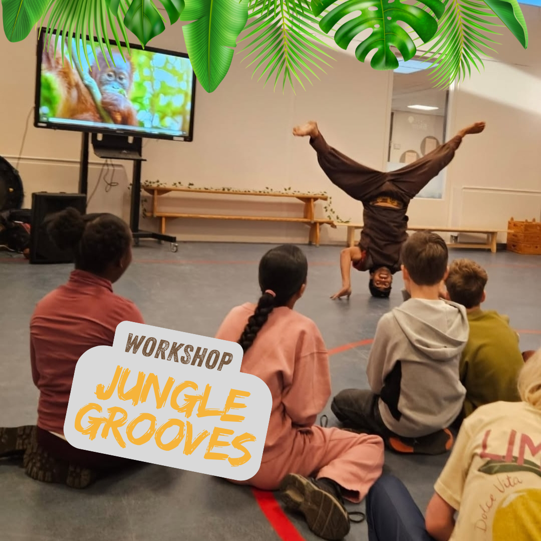 In de Jungle Grooves workshop staat dans centraal maar bevat ook spel en bewegings aspecten. Zowel voor de onder- als bovenbouw is de Jungle Grooves workshop geschikt en een groot speellokaal of gymzaal is de beste ruimte voor deze workshop.